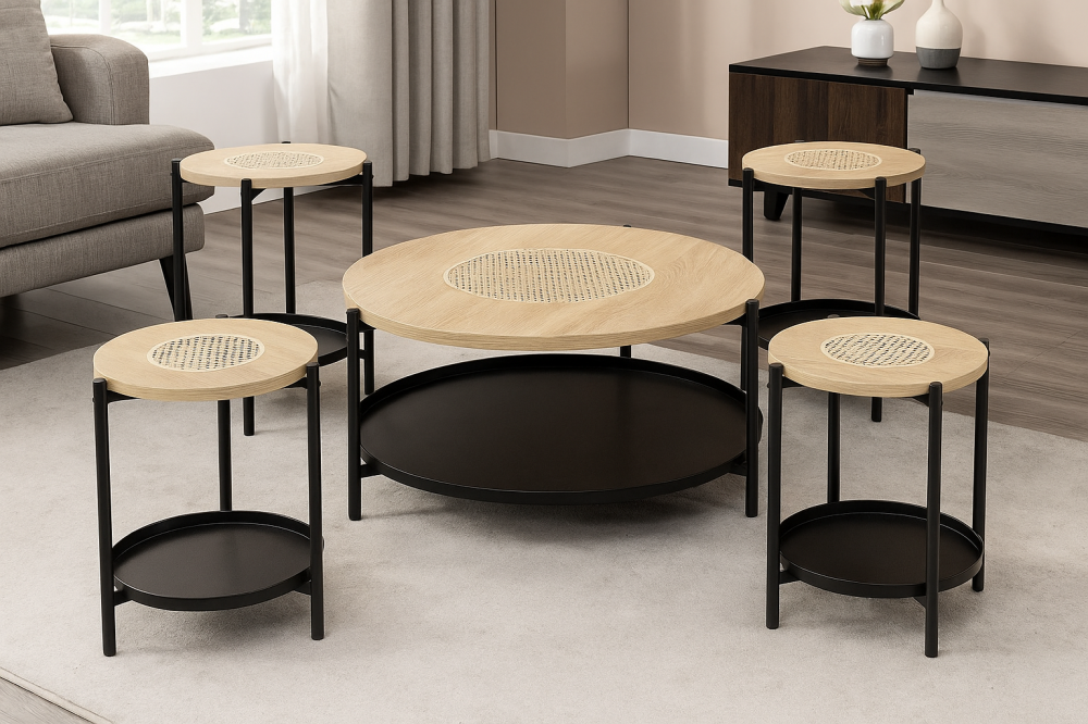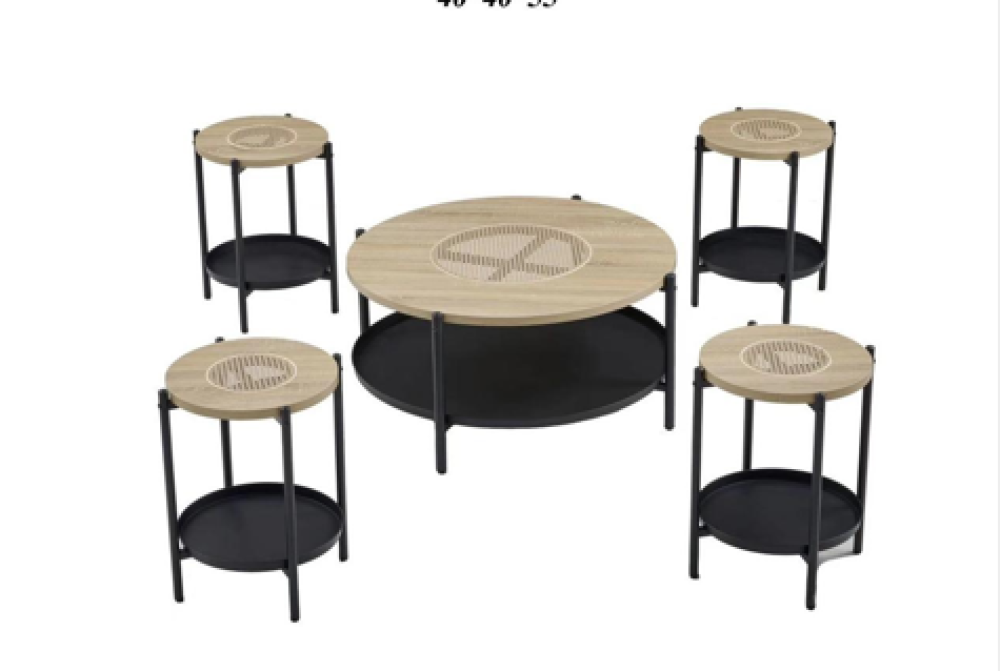 يتكون الطقم من طاولة رئيسية دائرية مع أربع طاولات جانبية متعددة الاستخدامات، ما يجعله الخيار المثالي لغرفة المعيشة أو الاستقبال.