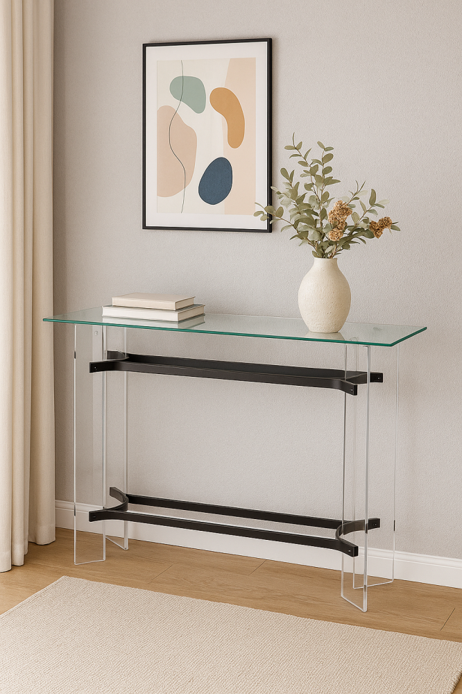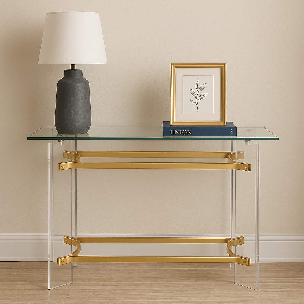 أضف لمسة من الأناقة العصرية والفخامة إلى ديكور منزلك مع هذا الكنسول المصمم بعناية من الأكريليك الشفاف واللمسات الذهبية اللامعة. يتميز بتصميمه الانسيابي وشفافيته العالية التي تمنح المساحة شعورًا بالاتساع والهدوء، بينما تضفي التفاصيل الذهبية لمسة راقية تلفت الأنظار.