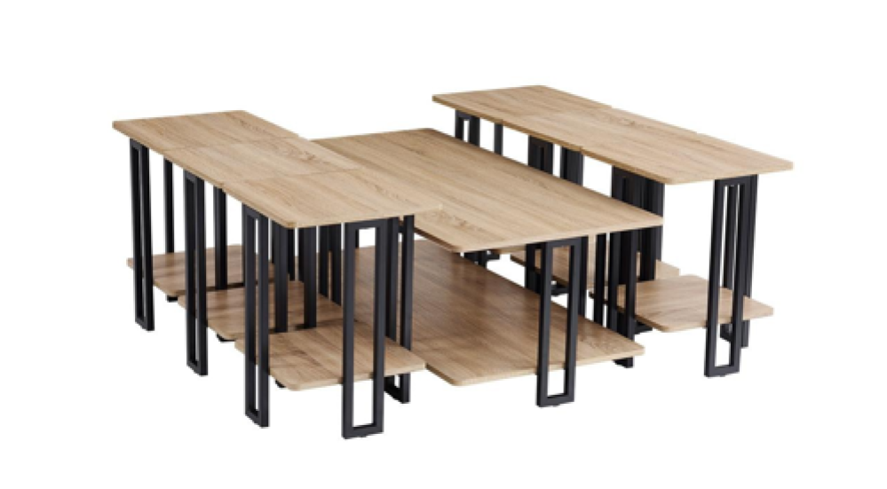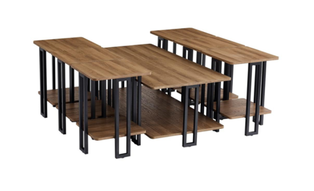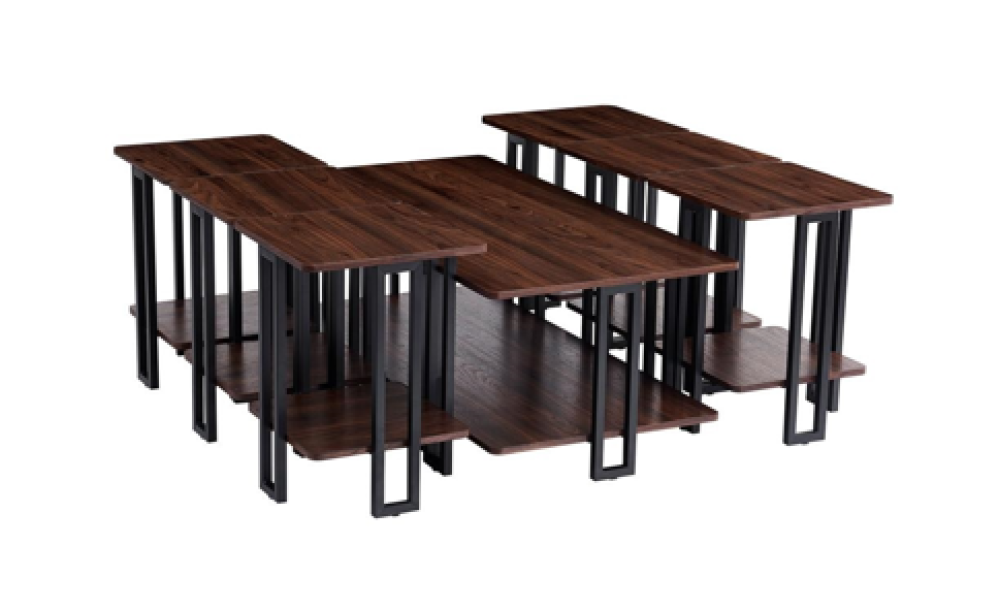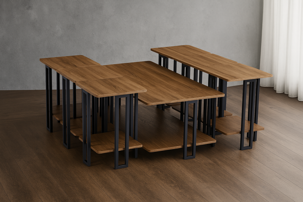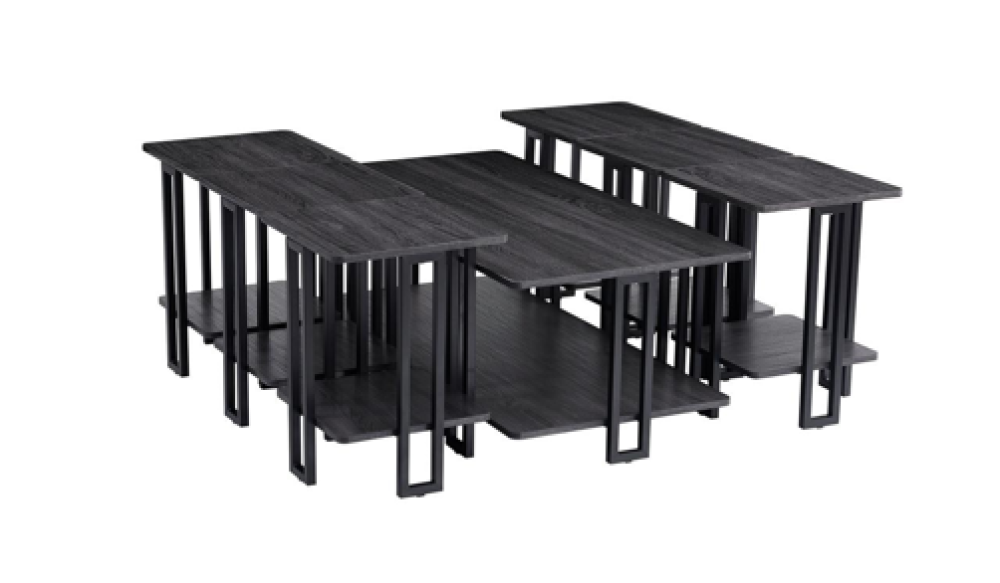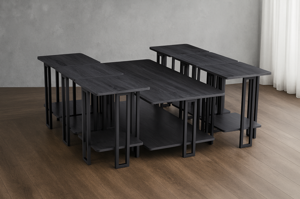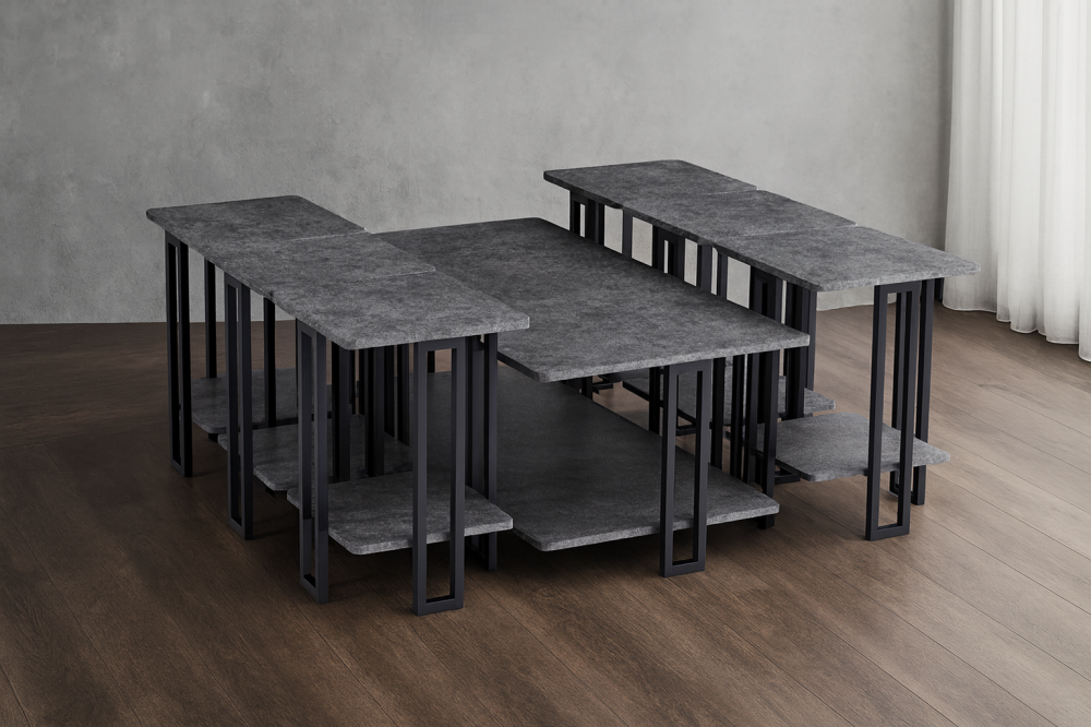 الوصف التفصيلي🛋️ طاولة حديثة بتصميم هندسي مبتكر تجمع بين سطح بلون رمادي داكن أنيق بملمس خشبي فاخر وهيكل معدني أسود مطفي يمنحها قوة وثباتاً.