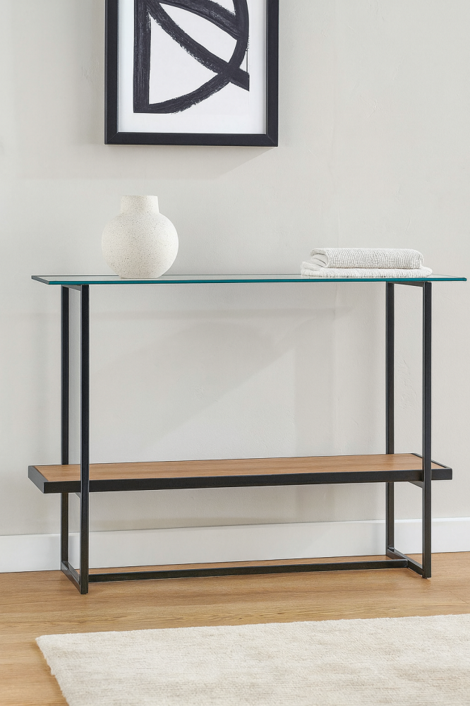 🛋️ كونسول بتصميم حديث يجمع بين البساطة والأناقة. سطح علوي زجاجي شفاف يمنح لمسة فاخرة وعصرية، مدعوم برف سفلي بلون خشبي طبيعي يضيف دفئاً عملياً للمساحة، مع هيكل معدني أسود مطفي يوفر ثباتاً ومتانة.