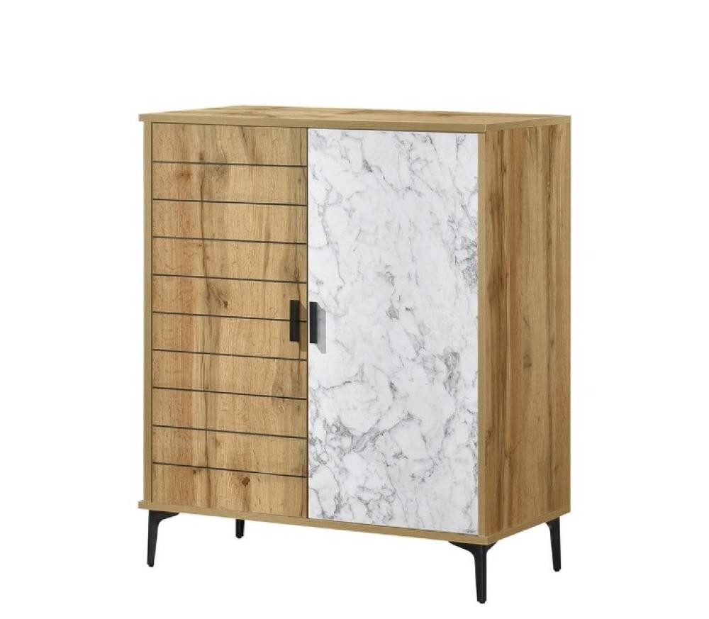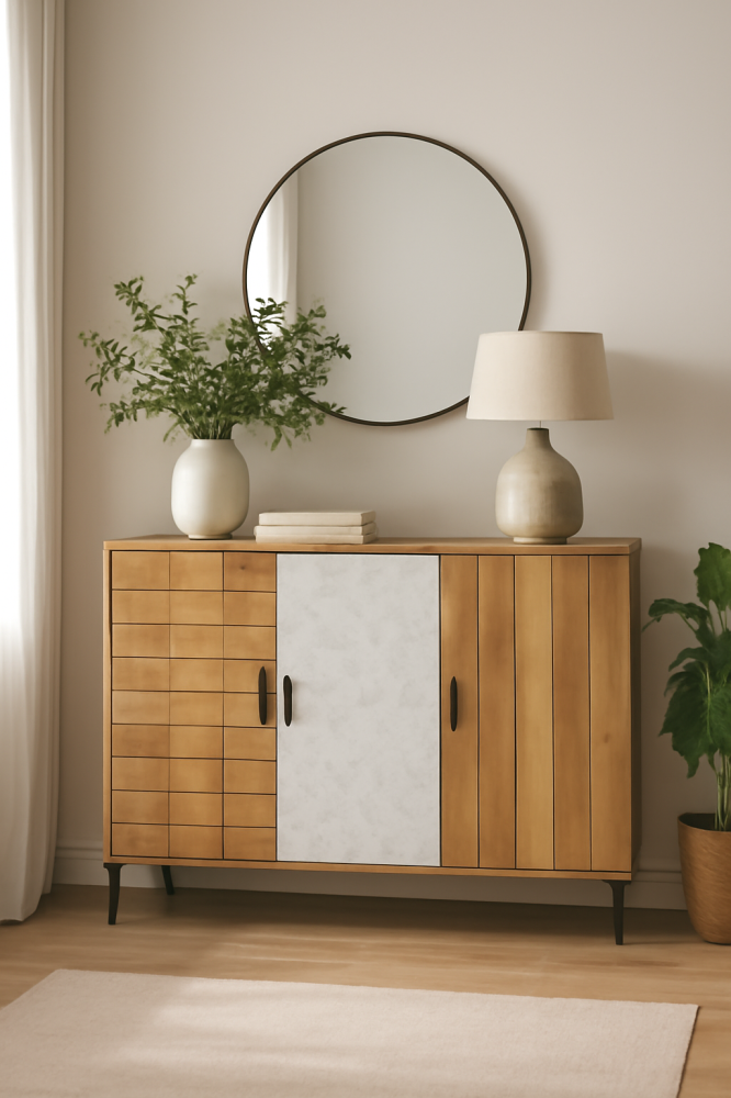 "تصميم عصري يلتقي بالأناقة – خزانة جانبية تجمع بين الخشب الرائع والرخام الفاخر"