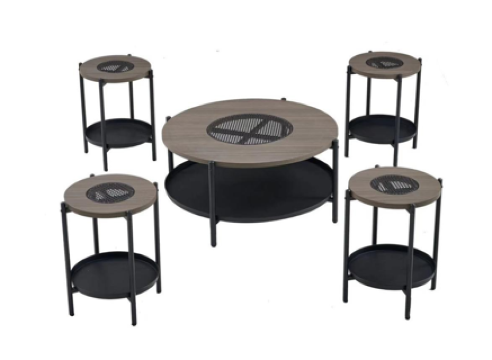 يتكون الطقم من طاولة رئيسية دائرية مع أربع طاولات جانبية متعددة الاستخدامات، ما يجعله الخيار المثالي لغرفة المعيشة أو الاستقبال.