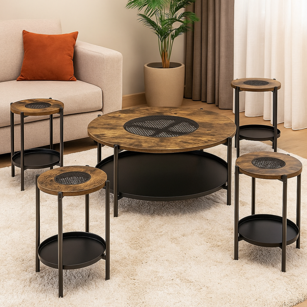 يتكون الطقم من طاولة رئيسية دائرية مع أربع طاولات جانبية متعددة الاستخدامات، ما يجعله الخيار المثالي لغرفة المعيشة أو الاستقبال.